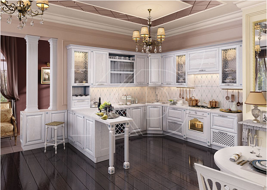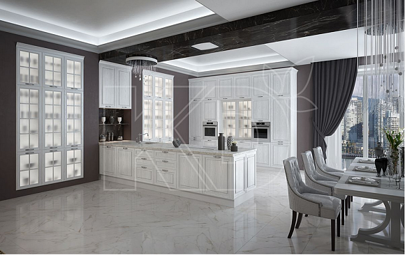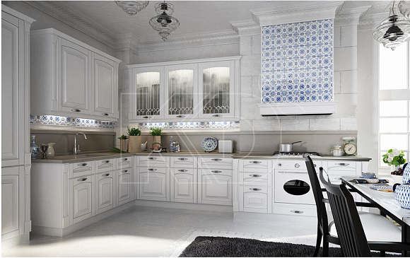 Белая кухня в стиле классика выглядит по-настоящему впечатляющей. Ее легко узнать по безупречной симметричности форм и обилию замысловатого декора. Поверхности гарнитуров украшает сложная резьба и фигурная фурнитура. Закрытые фасады комбинируются со стеклянными витражами и открытыми полочками, на которых красуются точеные колонны и балюстрады. В качестве других элементов декора могут выступать лепные элементы, инсталляции из кристаллов, резные карнизы. Нередко такую мебель украшают золотой патиной. Красиво выделяясь на белом фоне, она придает кухне эффектный антикварный вид.