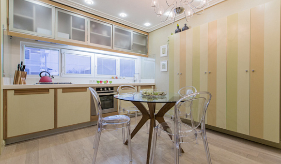 Неоклассическая кухня в бежевых цветах сочетает в себе традиционные и новаторские черты. Подобную модель можно узнать по лаконичным поверхностям, воздушности и легкости. Особенно хорошо смотрятся варианты кухни в стиле неоклассика, в которых глухие фасады комбинируются со стеклянными. Наличие подсветки в таких случаях только подчеркивает изысканность направления.