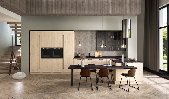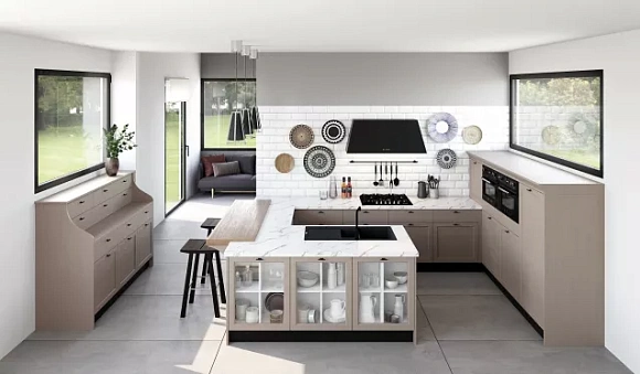 При выборе кухни в бежевом цвете, обратите внимание на ее дизайн. К одним из популярных относятся скандинавские модели кухни. Они отличаются простыми формами и строгими линиями. Фасады таких комплектов обычно гладкие или декорированные лаконичными узорами, стеклянными вставками. Версии сканди выбирают любители минимализма и комфорта.