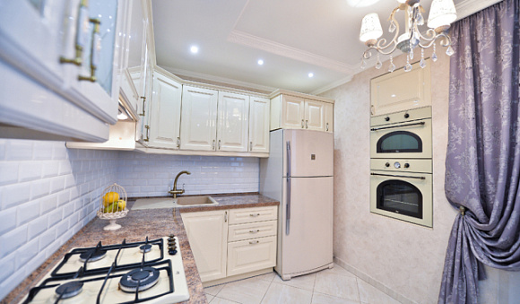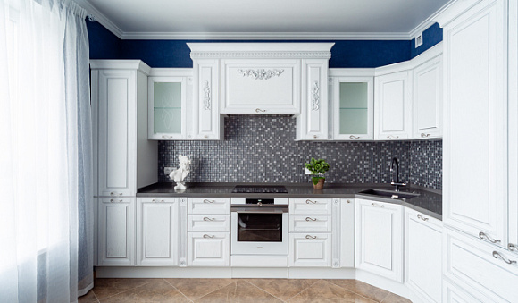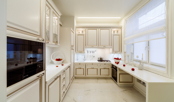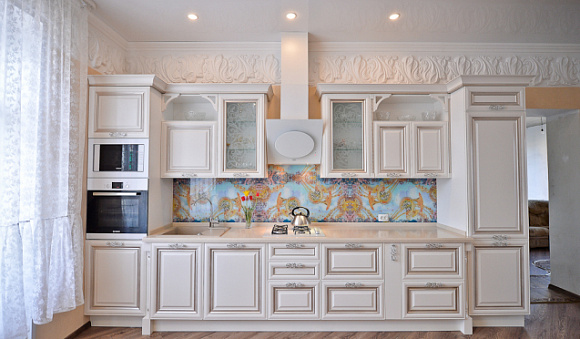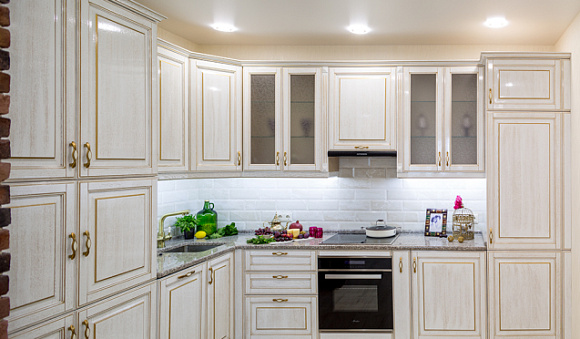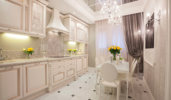 Классическая модель кухни привлекает внимание поклонников роскоши. В этом случае бежевые поверхности декорируют позолотой, патиной, флористическими рисунками и резьбой.