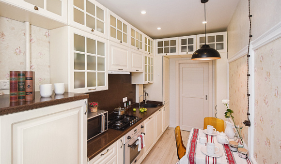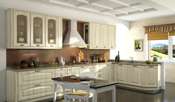 Создать уютный интерьер позволяет комплект кухни в духе кантри. Для этого направления характерна простота форм, массивность деталей и природная палитра. Беж в полной мере раскрывает красоту и гармоничность сельского стиля.