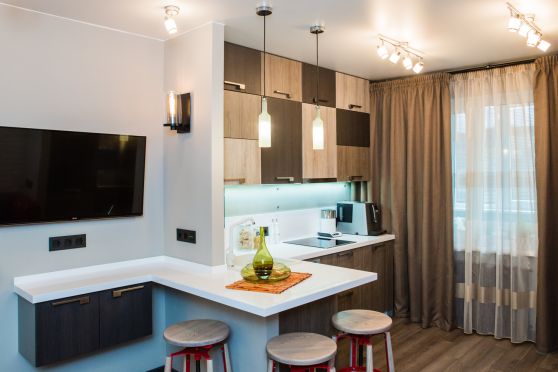 Разместив шкафы в оконных и дверных проемах, можно не только улучшить эстетический вид кухни, но и получить дополнительные места для хранения техники и кухонных принадлежностей.