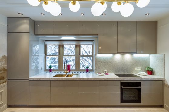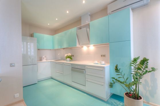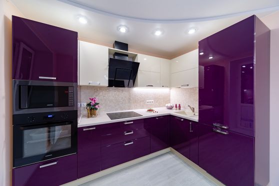 Богатая палитра оттенков. Глянцевые поверхности могут иметь любую расцветку. Помимо классических белых, бежевых и коричневых гарнитуров, производители выпускают версии желтого, красного, фиолетового, серого и зеленого цвета. Кухни на заказ могут сочетать в себе несколько оттенков. Такие комбинированные версии смотрятся весьма необычно и привлекательно.