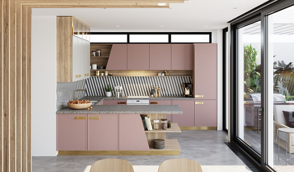 Г-образные гарнитуры позволяют рационально использовать свободный угол. В него обычно встраивают мойку, дополнительные полки или секцию для посуды. Это лучшее решение для комнаты средних размеров. Если вместо верхних шкафов в таком комплекте сделать навесные полки, в пространстве не возникнет затененности.