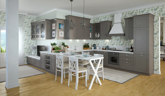Купить кухню для частного дома вы сможете в бренда «Кухонный двор». Здесь представлены версии из массива дерева, МДФ. Столешницы комплектов выполняются из натурального и искусственного камня, керамики.