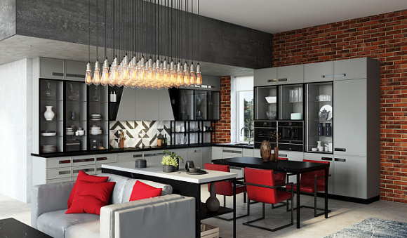 Для кухонной зоны, совмещенной с гостиной, подойдет островной комплект. С его помощью можно визуально разбить пространство. Островную конструкцию при этом используют в качестве дополнительной рабочей поверхности и обеденного стола.
