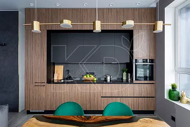 Для проходной прямоугольной комнаты лучше купить кухню в два ряда. Шкафы такого гарнитура выстраивают вдоль двух стен друг напротив друга, оставляя межу ними проход не меньше 1,2 метра. Такое расстояние обеспечит комфортное перемещение и не создаст неудобств во время открывания дверец.