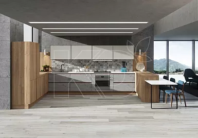 В просторных квартирах-студиях и отдельных помещениях площадью от 12 квадратных метров часто используют островные комплекты. Модули при такой планировке устанавливают вдоль одной или двух стен, в виде буквы П. Дополнительные навесные полки и шкафы часто размещают у окна.