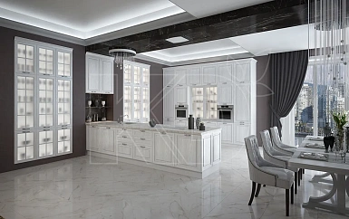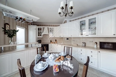 Классическая кухня отличается элегантностью, изяществом и роскошью. Подобные решения подходят для просторных помещений с высокими потолками и большими окнами. В небольших комнатах кухонная мебель в стиле классика будет смотреться несколько нелепо и вычурно из-за того, что для ее оформления используется роскошный декор – позолоченные элементы, лепнина, резьба, патина, изогнутые ручки.