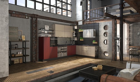 Красная кухня в стиле лофт – подходящее решение для средних и просторных комнат. Выбирая подобную версию, дополните интерьер соответствующими деталями – элементами кирпичной кладки, рулонными шторами и аксессуарами из металла.