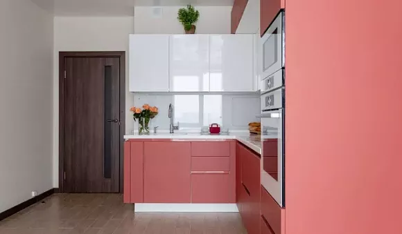 Светло-розовый гарнитур в скандинавском стиле можно интегрировать в небольшое помещение. От ярких и темных оттенков красного в этом случае лучше отказаться. Такие расцветки допускается использовать точечно.