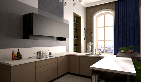 В большое изолированное помещение лучше интегрировать П-образную модель. Ее модули займут место возле трех смыкающихся стен. Преимуществом такого комплекта является большое количество полок, ящиков и секций, а также несколько рабочих зон. Это подходящий вариант для готовки семьей или компанией.