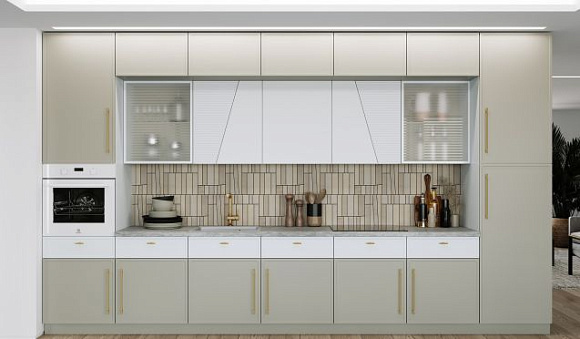Линейные модели подходят для обустройства компактных комнат. Подобный вариант не займет много места, при этом вместит в себя всю необходимую технику и посуду. А если вместо верхних шкафов использовать открытые навесные полки, в помещении не возникнет ощущения затененности.
