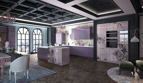 Заказывая гарнитур в квартиру-студию, обратите внимание на островную модель. Данная версия визуально отделит обеденную зону от гостиной. К тому же остров можно использовать вместо обычного обеденного стола.