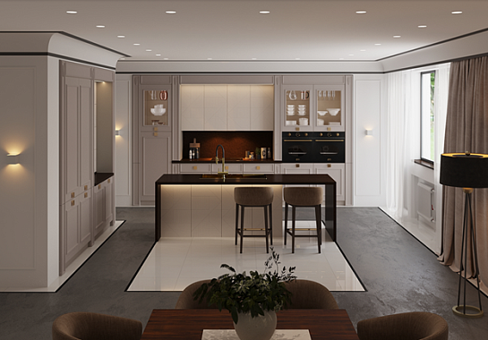 На нашем сайте можно купить нестандартную кухню в стиле классика модерн на заказ с доставкой в Кирове.