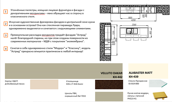 Качественная и красивая, кухня в современном стиле «Астрид» - это показатель хорошего вкуса у хозяев и особенного стиля. Потому что сочетает в себе и современную практичностью и классическую красоту. Поэтому, многие останавливают свой выбор именно на этой модели.
