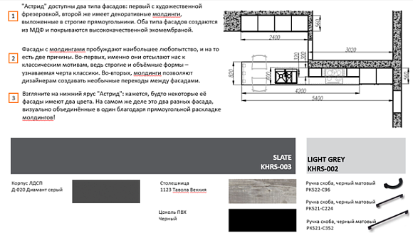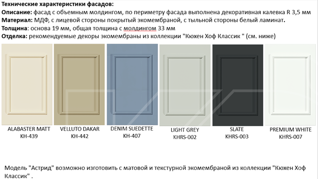 Из каких материалов изготовлена кухня «Адриана»: Корпус изготавливается из ЛДСП, фасады из МДФ. Отделка фасадов: экомембрана. Контрастная столешница в обеденной зоне – финальный штрих, вносящий нотку модерна в благородный неоклассический облик.