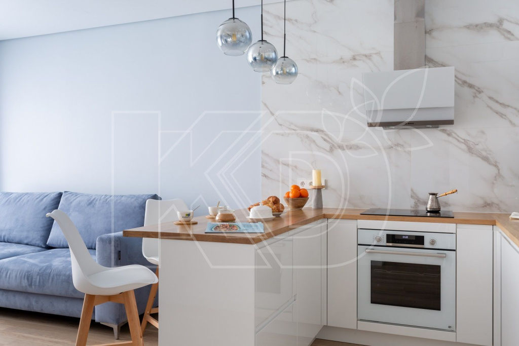 Отсутствие навесных шкафов не означает отказ от дополнительного освещения. Осветительные приборы можно разместить на стенах. Например, симметрично расположенные светильники. Для освещения рабочей зоны оптимально использовать свисающие с потолка лампы на тросах. Они смотрятся стильно и эффектно. Светодиодные ленты и точечные споты можно расположить на коробе, в котором скрыты коммуникации. Такой подсветки хватит для качественного освещения кухни П-образной без верхних шкафов.
