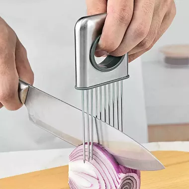 Сначала может показаться, что это самый бесполезный прибор. Но в действительности держатель для лука так же необходим, как кухонная мебель. С помощью него можно легко и быстро нарезать лук без контакта с самим продуктом, поэтому руки после нарезки не будут источать неприятный запах. Преимущество аксессуара еще и в том, что он очень недорогой, поэтому будет доступен каждой хозяйке.