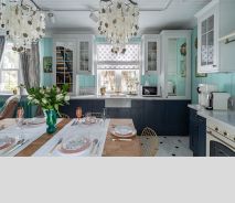 А теперь посмотрим на витражи. В навесных шкафах они прозрачные, а в высоких настольных буфетах – зеркальные. Зеркала позволяют размещать аксессуары, обычно не свойственные буфетам. Например, сушилку для посуды. А ещё зеркальные стёкла визуально расширяют помещение, «облегчая» образ кухни. Этой лёгкости вторит тщательно подобранная по цвету бытовая техника. Белоснежная варочная панель и бежевая духовка гармонируют как с фасадами, так и с роскошной каменной столешницей. Кстати, столешница имеет интегрированную мойку, размещенную прямо напротив окна. Такую мойку всегда приятно использовать, особенно в погожий денёк!