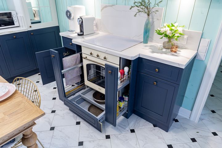 Этой кухней стала «Беатрис» – абсолютно эксклюзивная модель, которой еще нет ни в одном нашем каталоге! Иоланда стала первой владелицей этого уникального классического гарнитура. В чём его уникальность? Во многом! Взгляните, для начала, на фасады. У «Беатрикс» они имеют тонкие желобки по наружному периметру рамок. Благодаря этому создаётся иллюзия крайне редких, вкладных фасадов, которые характерны лишь для дорогой антикварной мебели. Презентабельной внешности соответствуют не менее презентабельные материалы. Фасады «Беатрис» выполнены из массива и шпона натурального ясеня. Их естественная текстура великолепно смотрится в тёмно-синем и белом цветах.